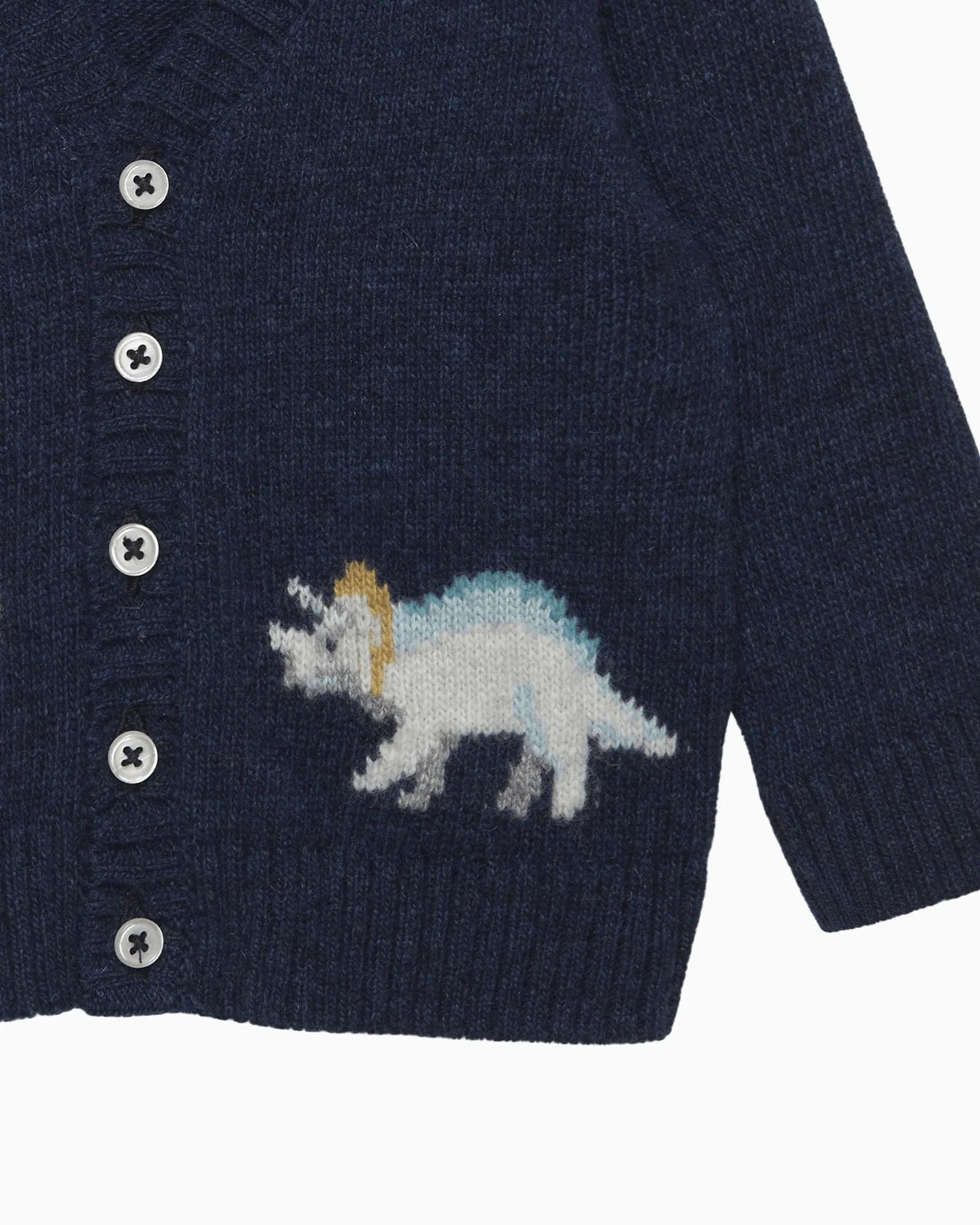 Elevate your little one's look with this sophisticated, navy marl cardigan. This cosy piece is crafted in a warm wool mix and features our sweet little Triceratops intarsia design sitting along the hemline. Complete with pearlised button fastenings, it's the perfect great go-to layer for this autumn/winter.