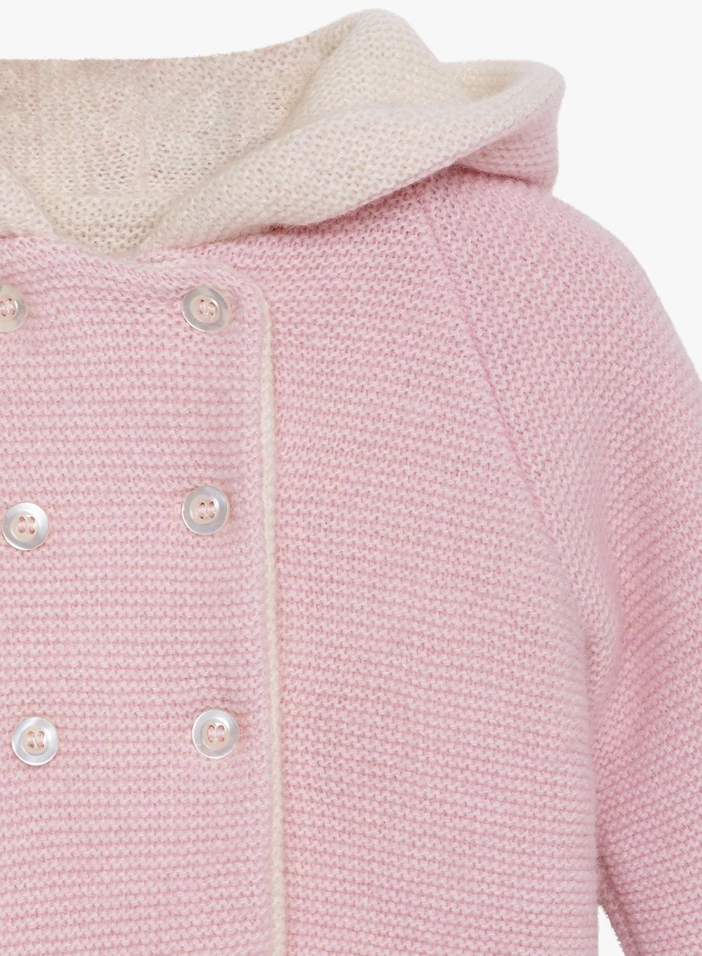 Our cashmere mix Baby Pink Knitted Coat is ideal for layering up featuring double thickness for warmth and double breasted with pearlised buttons, they're the perfect for wrapping up your little one this winter. The hood provides extra warmth and adorable bear ears for cute-factor.