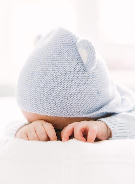 These gorgeous cashmere and merino wool mix hats for newborns come in a unisex off-white colour as well as a soft blue and pink and feature adorable teddy bear ears. Available in two sizes: 0-3 months & 3-6 months.