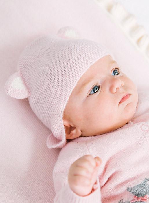 These gorgeous cashmere and merino wool mix hats for newborns come in a unisex off-white colour as well as a soft blue and pink and feature adorable teddy bear ears. Available in two sizes: 0-3 months & 3-6mths.