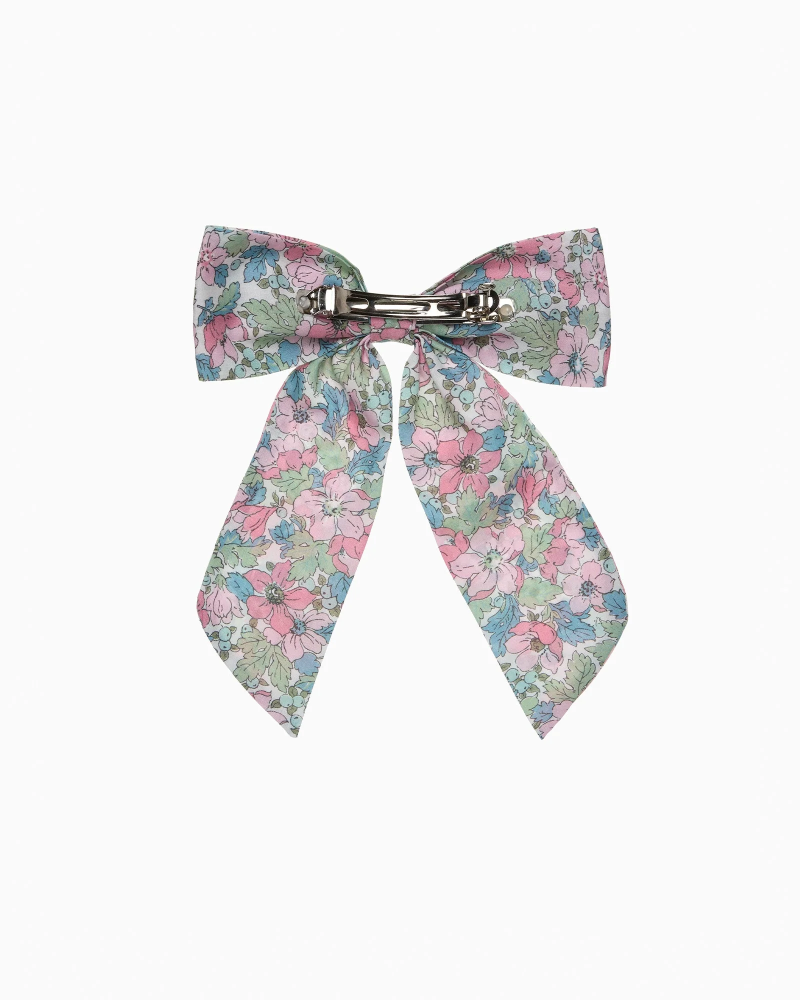 This pretty bow hair clip is made in Liberty's Dahlia Dream fabric, a charming multidirectional floral that unveils a blooming meadow of Mignon dahlias, pirouetting across a leafy canopy sprinkled with scattered berries. The perfect accessory to elevate your spring/summer wardrobe, it comes complete with a grosgrain backing and barrette clip that will securely hold all hair types.