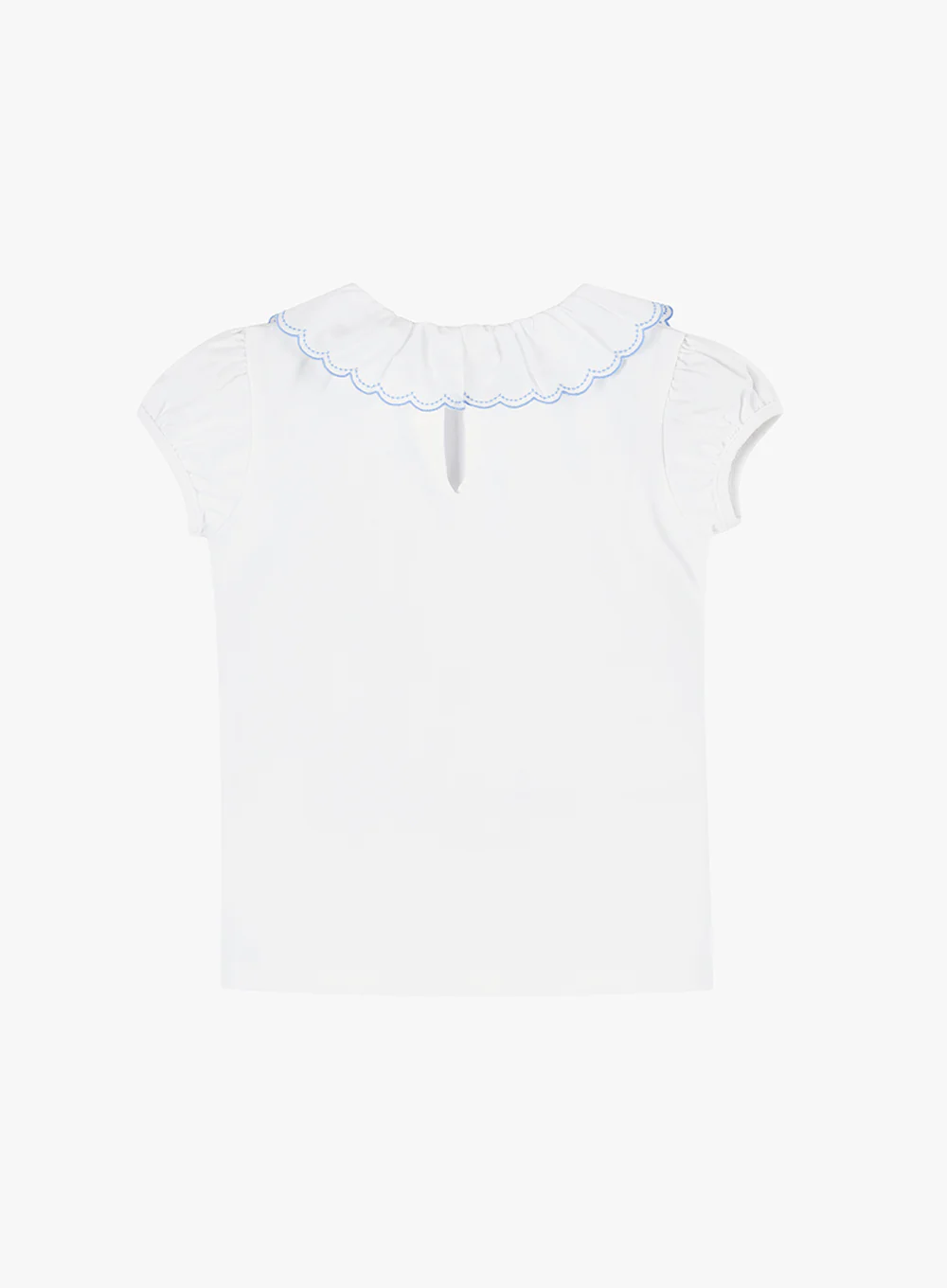 A classic white t-shirt with a twist, our Isabella top is made in a super soft jersey and features the addition of our signature willow collar, complete with the addition of pale blue embroidered detailing around the edge. An update on a wardrobe staple, it's perfect for pairing with shorts, skirts and jeans.