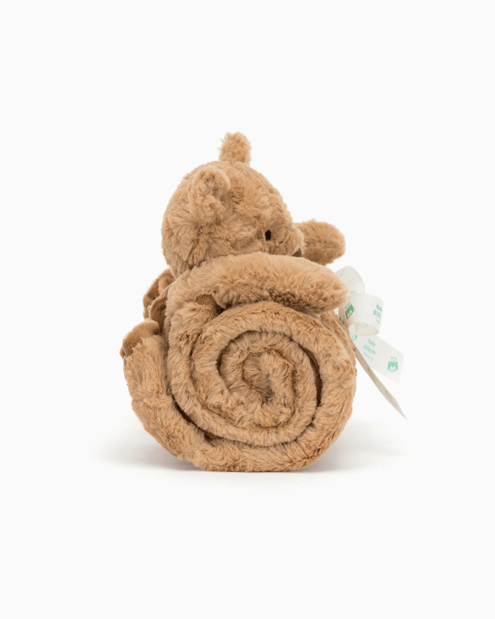 The Bartholomew Bear Blankie is a gorgeous gift of gently textured softness, featuring our most loved bear, rolled and presented in a Baby Jellycat grosgrain ribbon. Made with recycled fibres, this soft blankie has Bartholomew Bearās gently rounded head and ears and outstretched arms peeking over the edge ensuring a favourite friend is never far away.