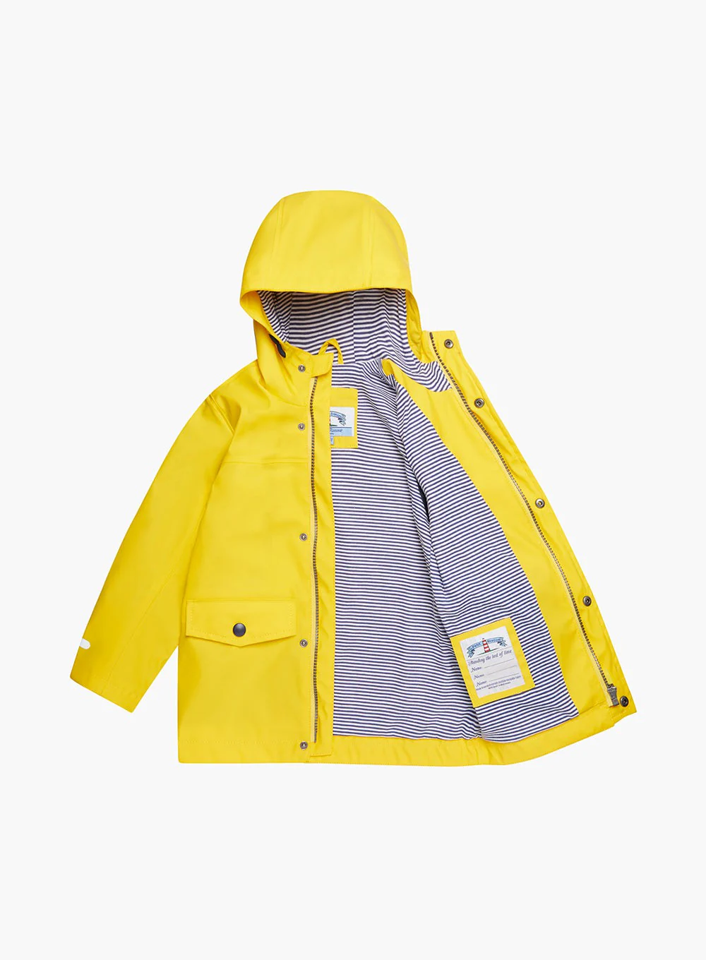 Back by popular demand, our iconic waterproof raincoat has a classic nautical style and comes with a cosy navy striped jersey lining for optimum comfort. Fully waterproof and machine washable, it features both zipper and popper fastenings to keep out every last drop. Handy reflective strips allow for high visibility, come rain or shine. Perfect for little adventurers on land and sea, it sure to stand the test of time and comes with space to add 3 names inside as it gets passed down to your family and friends.