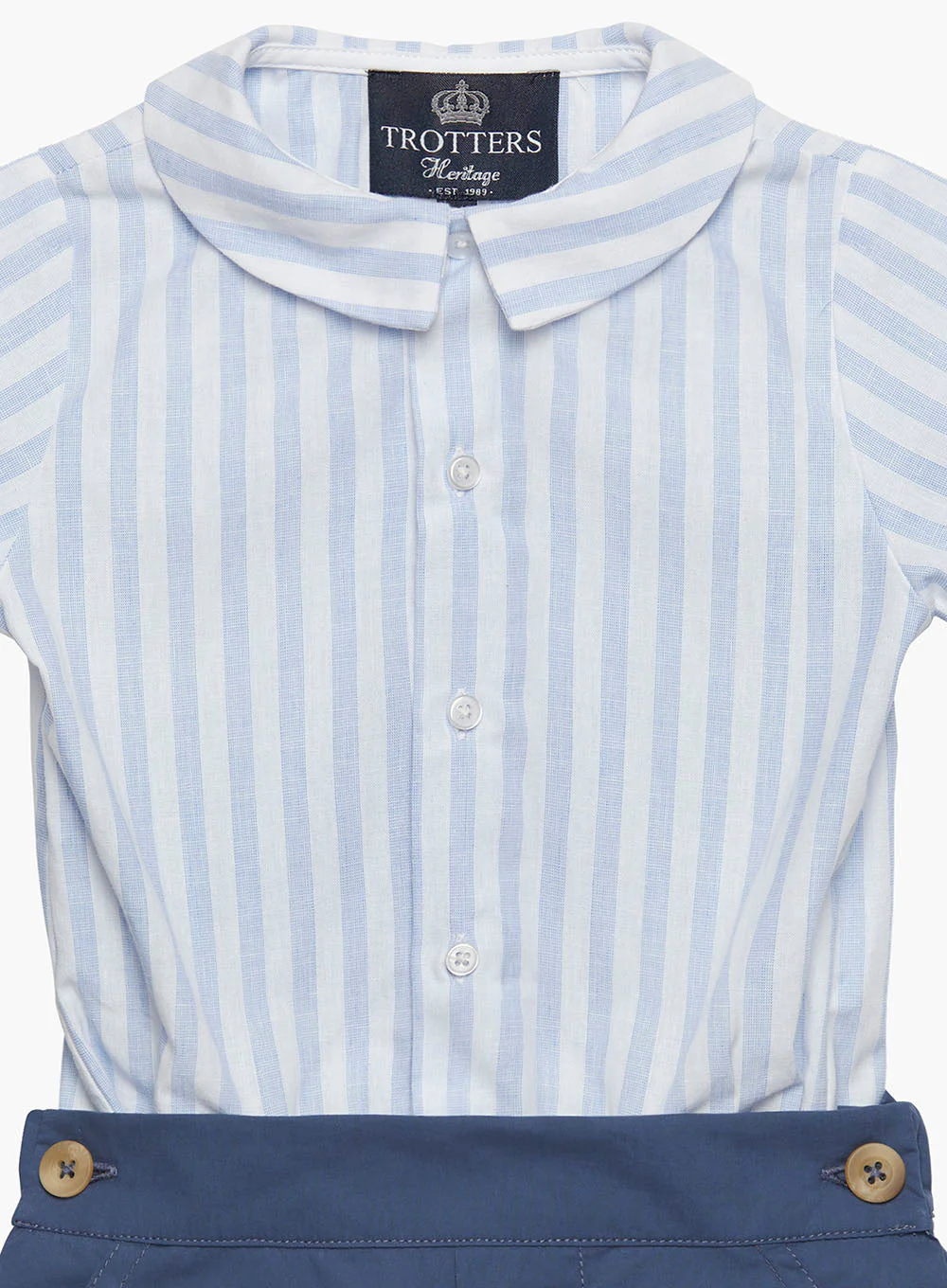 Our best-selling Rupert set has been updated for spring/summer and now comes with a smart, pale blue striped cotton short-sleeved shirt and pearlised button fastenings. It neatly fastens via concealed buttons to a classic pair of navy shorts and makes a great, all-in-one outfit for babies and young boys that will keep little tummies under wraps during those smarter occasions.